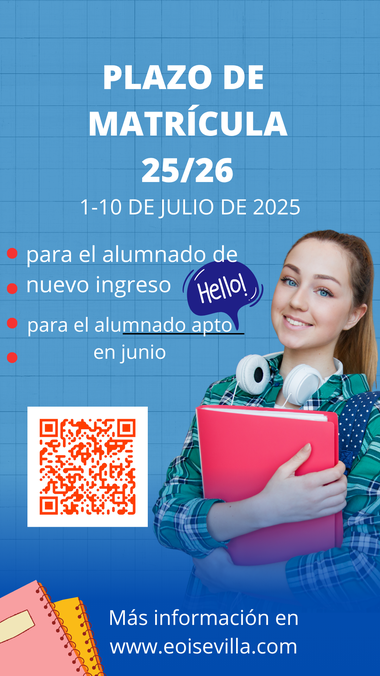 La EOI Sevilla-Macarena estará cerrada desde el viernes 18 de julio a las 13:30 hasta el 31 de agosto. Retomamos nuestra actividad lectiva y administrativa en el horario habitual a partir del 1 de septiembre.