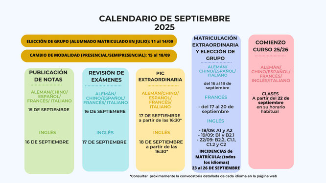 Puede consultar la convocatoria de exámenes de septiembre de todos los idiomas y niveles. Compruebe la fecha y hora de cada actividad de lengua a la/s que se tiene que presentar. Las partes orales pueden tener lugar con anterioridad a los escritos. Ver AQUÍ.