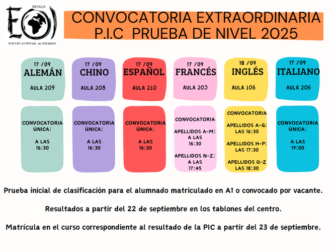 Las Pruebas Iniciales de Clasificación para acceder a niveles distintos de A1 tendrán lugar el 26 de junio en horario de tarde. Para acceder a la convocatoria completa (aulas y horarios) y ver la tipología de pruebas, haga clic en el idioma correspondiente: