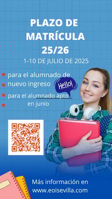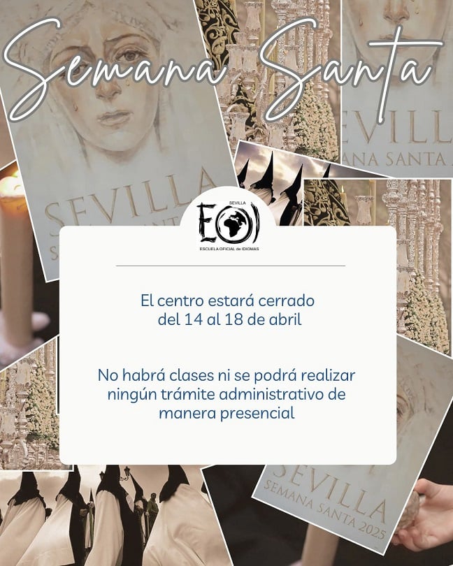 La EOI Sevilla-Macarena estará cerrada desde el viernes 18 de julio a las 13:30 hasta el 31 de agosto. Retomamos nuestra actividad lectiva y administrativa en el horario habitual a partir del 1 de septiembre.